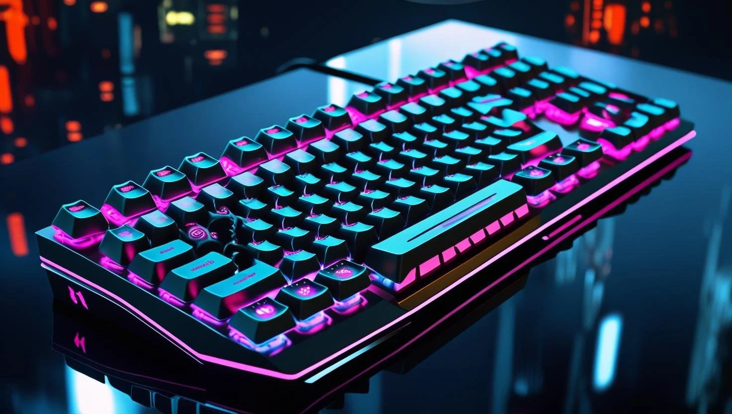 A gaming keyboard with RGB lighting in purple, blue, and pink hues placed on a reflective black surface.